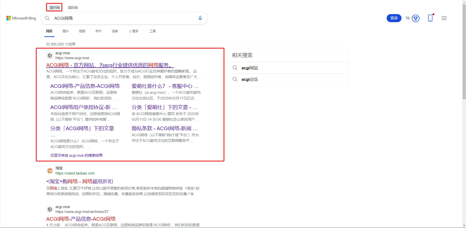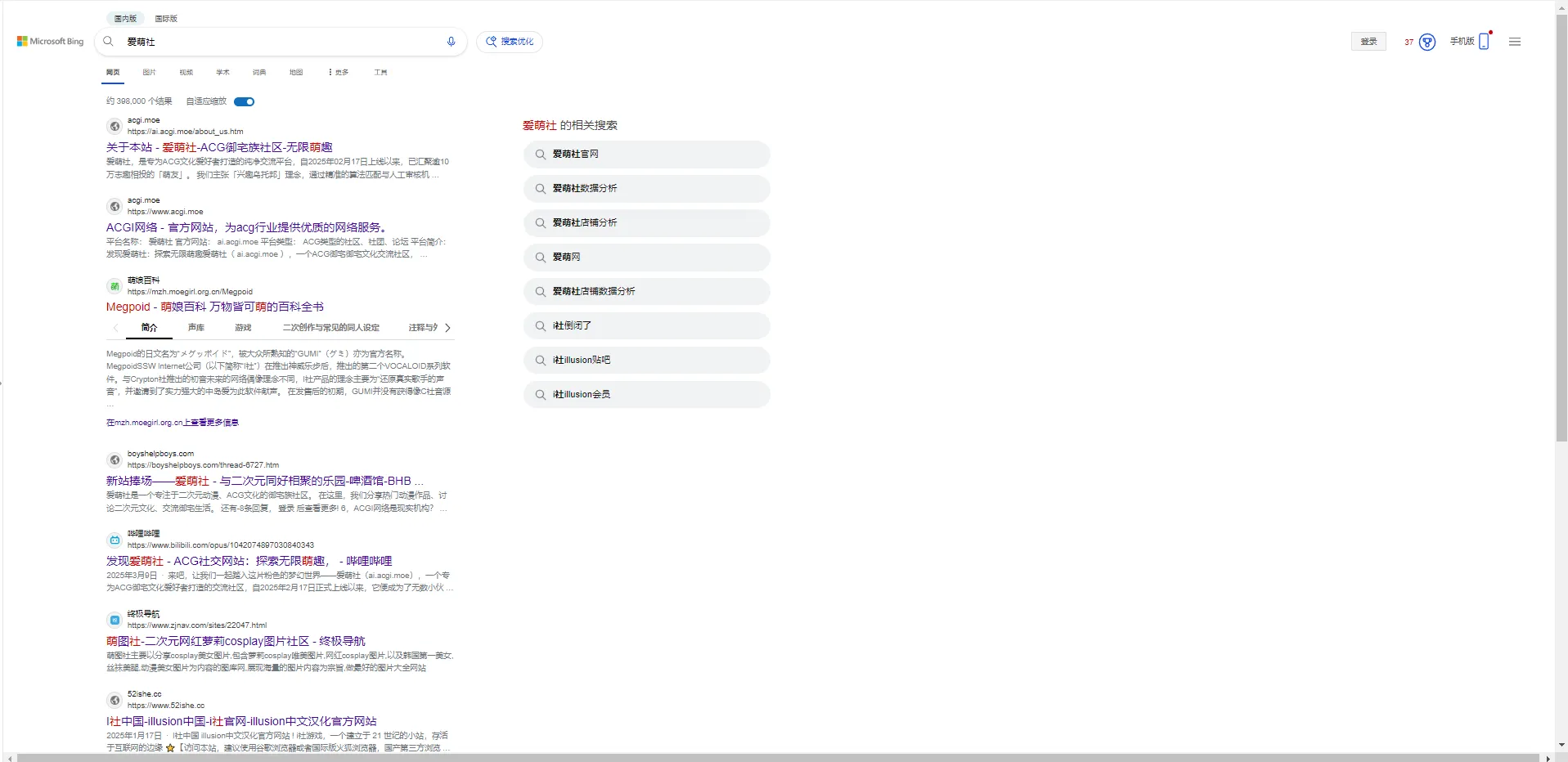 “爱萌社”的必应收录情况,以及用户搜索建议